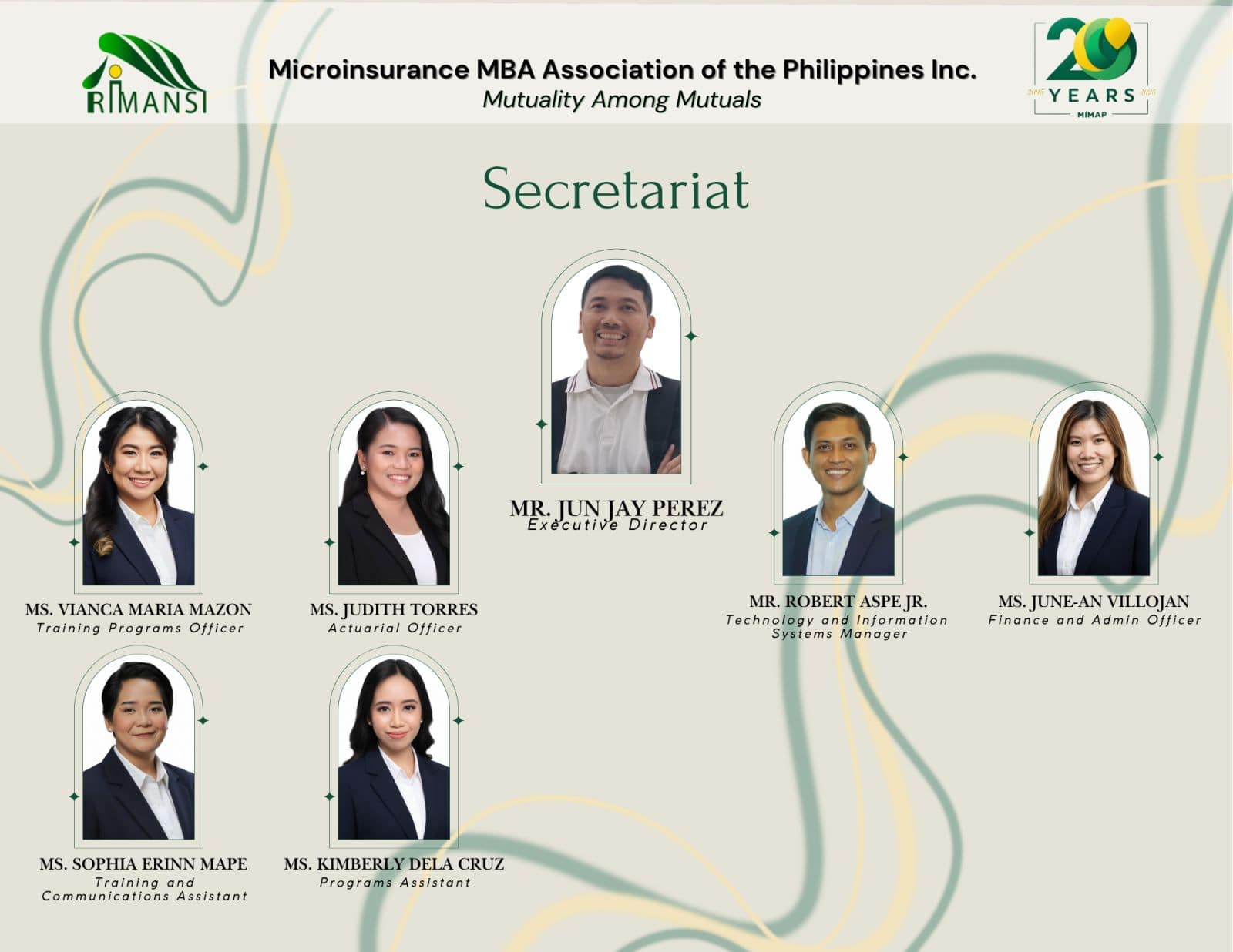 From Middle: Jun jay Perez - Executive Director, From Left Vianca Castillo - Training and Communication Officer, Judith Torres - Actuarial Officer, From Right Robert Aspe Jr. - Technology and Information Systems Manager, June-Ann Villojan - Finance and Admin office, Lower Left Sophia Erinn Mape Traning and Communication Assistant, Kimberly Dela Cruz Program Assistant.